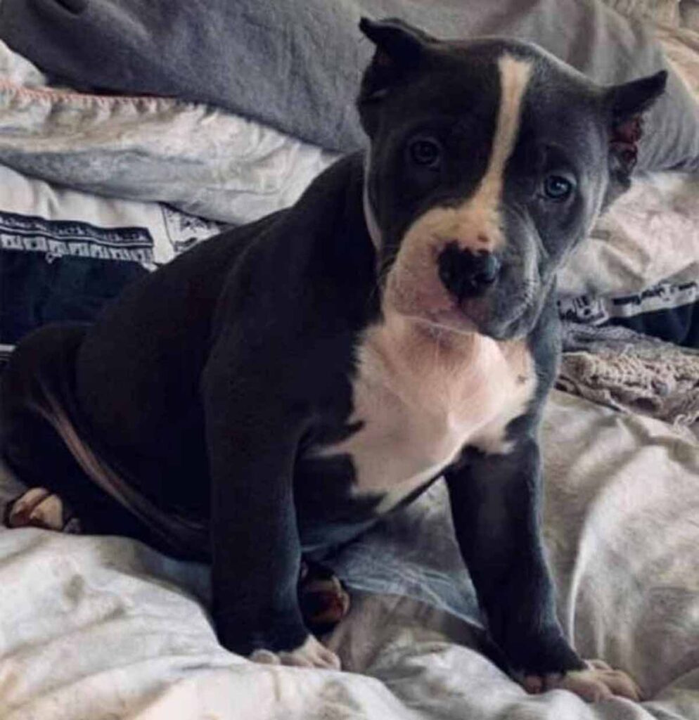 The dog is described as being an American Bully XL which has a blue/grey colour and a white marking on its face. It is female and nine-weeks-old.