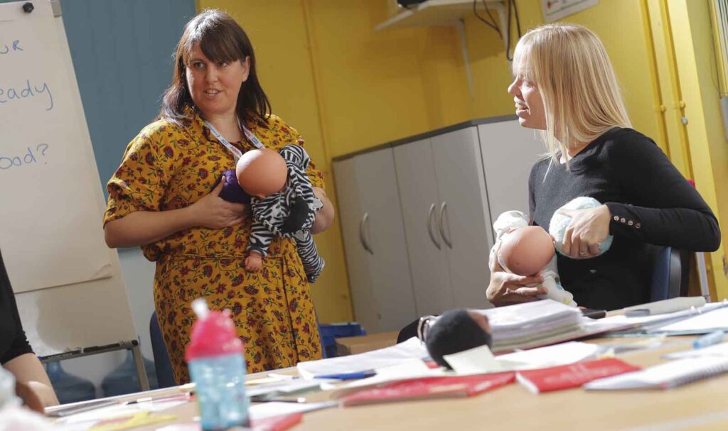 Corinna Weatherill (Infant Feeding Coordinator, KCHFT) training breastfeeding volunteer Kathryn Maddox at Woodgrove children’s centre, Sittingbourne. This picture was taken in 2019 pre-Covid.