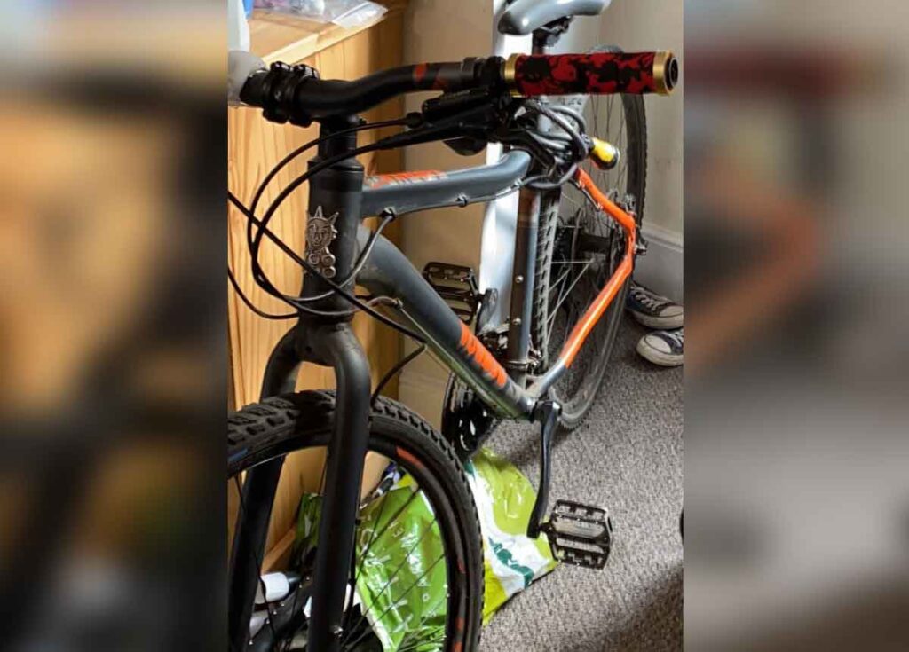 The bicycle is described as an orange and black Voodoo hybrid bike and has black and red grips with gold trim on the handlebars and a buckled back wheel.