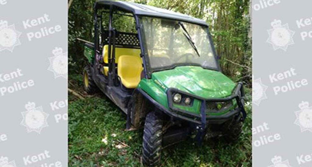 A John Deere Gator, worth more than £10,000, which was stolen on Sunday has been found in a wooded area off the A2 in Dover on Tuesday 17 May 2022 by a local farmer.
