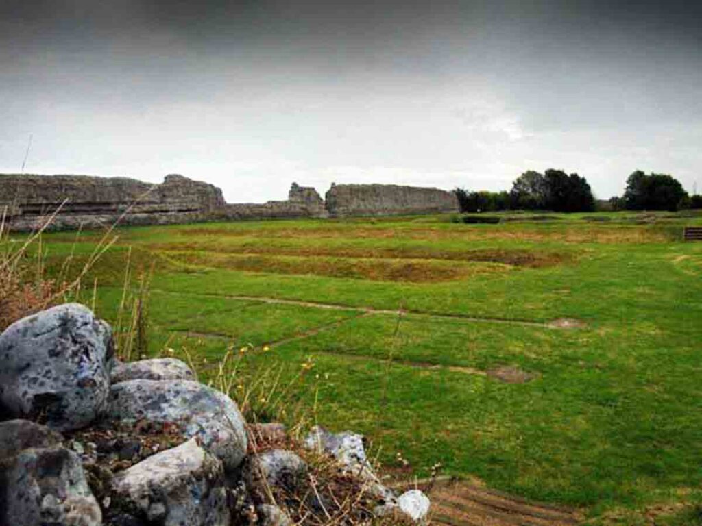 At the entrance to the defences, in 2021, a new generation of archaeologists exposed the large holes in the Roman ground surface which had held the large timber posts that had supported a wooden gateway and tower. This tower guarded an entrance to the fortification, inside which soldiers and supplies were assembled after disembarkation from a fleet of ships. Now, centuries later, based on the archaeological evidence and Roman sculptural sources, English Heritage has intricately reconstructed the ancient Roman defence exactly above the site of the original.