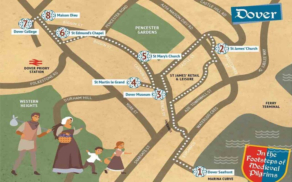 The trail links eight historic sites in Dover connected with pilgrimage, from the seafront where weary pilgrims arrived by sailing ship, to the Maison Dieu where poor pilgrims stayed the night.  Also included are the ruins of both St James’ Church and St Martin Le Grand, Dover Museum, St Mary’s Church, St Edmund’s Chapel, and Dover Priory (Dover College).