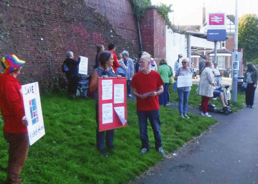 By Ray Duff – A protest against the planned closure of rail ticket offices and the reduction of bus routes took place near Folkestone Central station on Wednesday evening.