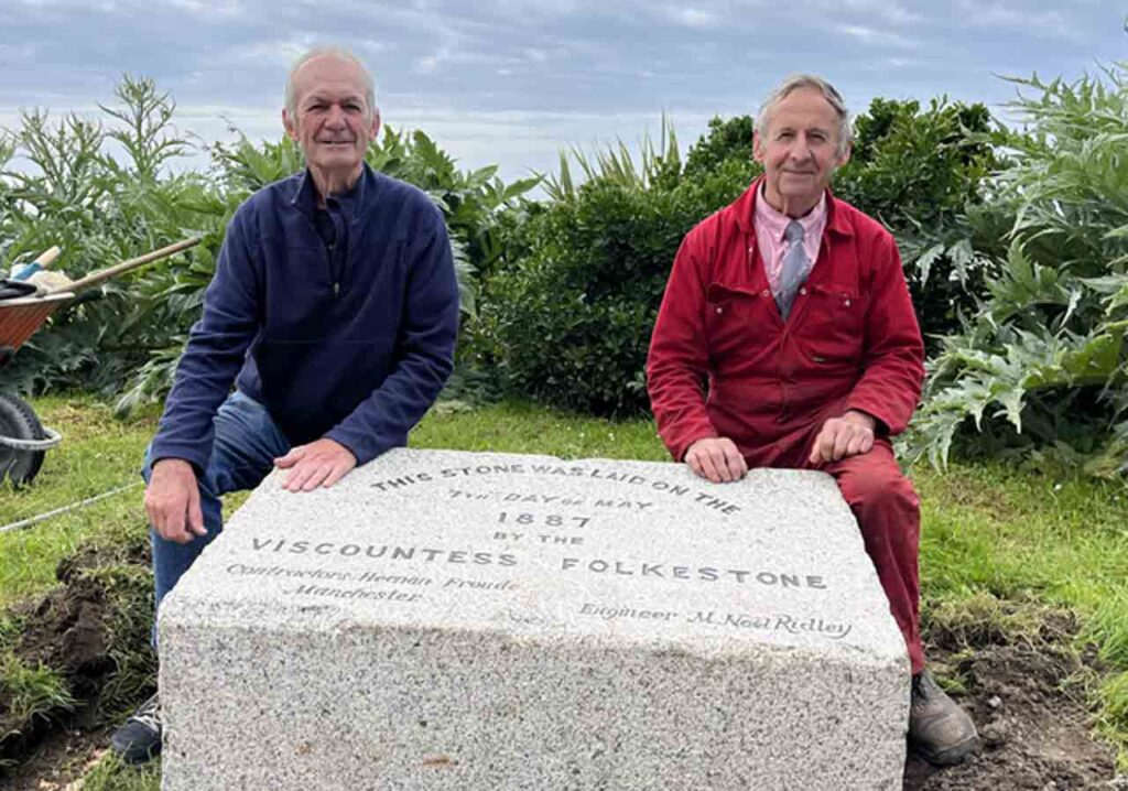 Go Folkestone’s Tony Hill (left) and salavage yard owner Colin Shevill (right) with the freshly placed Folkestone Pier Foundation Stone