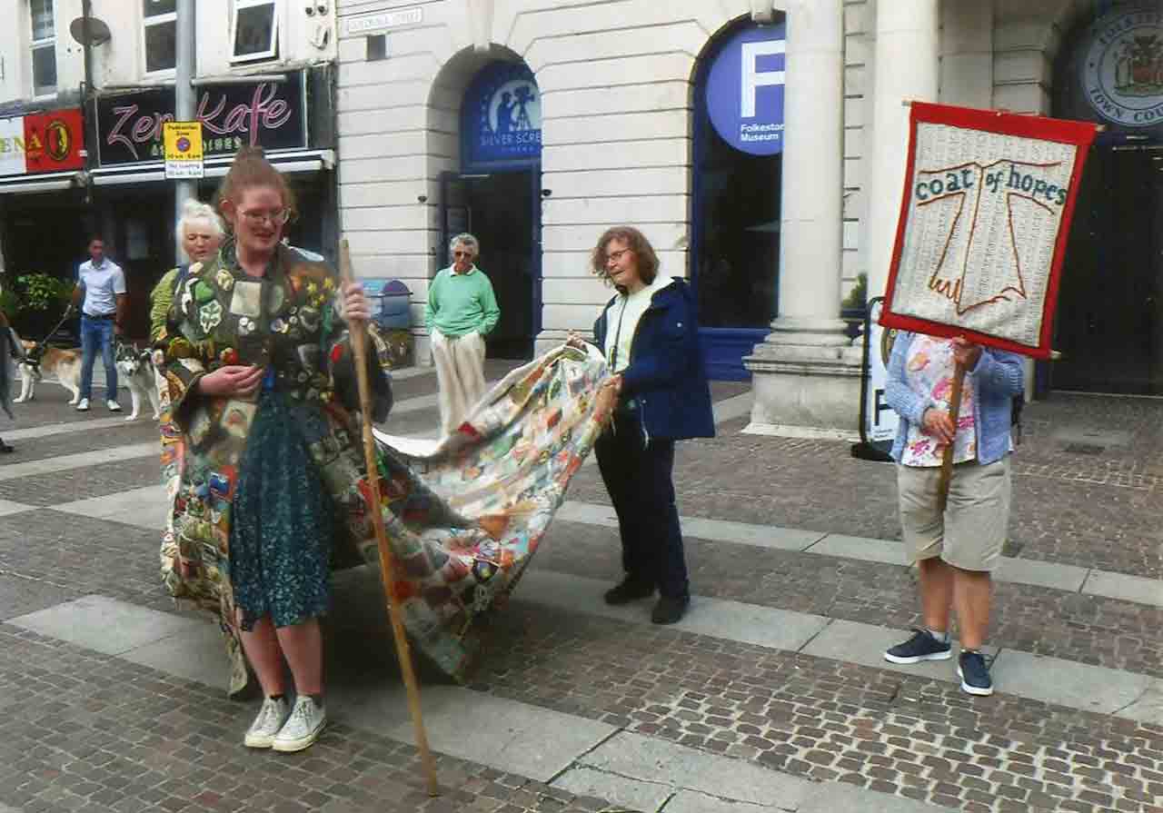 After a three-month stay, the magnificent ‘Coat of Hopes’, a huge, multi-patched quilted garment, has embarked on the next leg of its journey. This unique symbol of community, peace, and environmental hope was given a lively send-off as it departed Folkestone on Saturday.